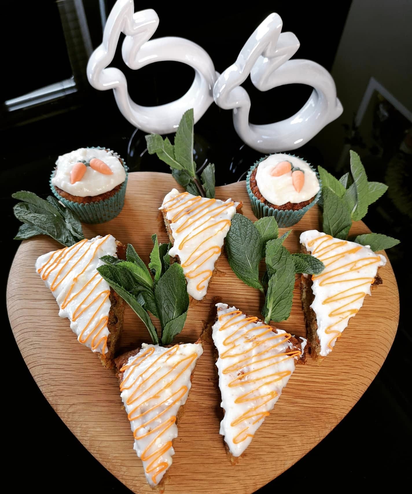 If you'd rather stick with a regular carrot cake, why not decorate them to look like carrots for a twist! I used a carrot cake tray bake recipe and then smothered in cream cheese frosting before cutting into triangular carrot shapes. Orange writing icing, or orange candy melts finely piped across them adds colour and a sprig of mint leaves in the top makes a great 'carrot top'!