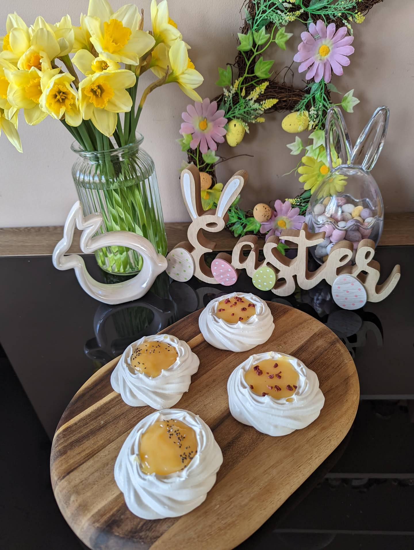 These are super easy sweet treats for an Easter dessert or sharing table and look really cute! You can whip up your own meringue nests or to make these even easier, you can buy meringue nests in most supermarkets as well! For the nests, either whip some double cream or use squirty cream to fill and top with mini eggs and some chocolate shards. I like to break up a flake for this! The 'fried' eggs are instead filled with lemon curd and optionally can be sprinkled with poppy seeds/chia seeds to represent a bit of pepper!